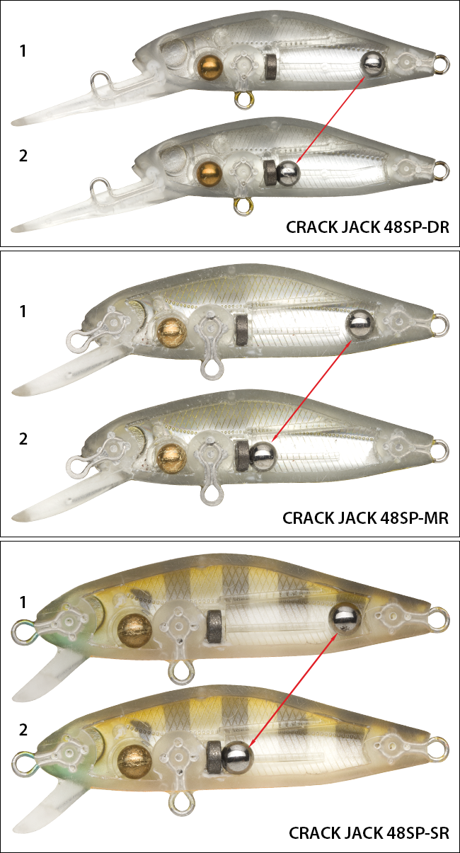 Внутреннее строение воблеров Crackjack 48SP и положение подвижных грузов при забросе (1) и проводке (2)