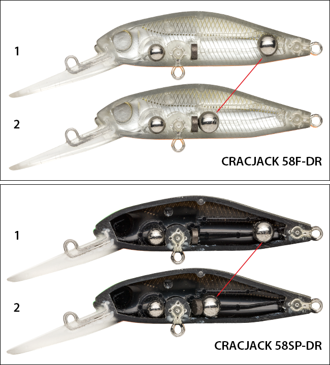 Внутреннее строение воблеров Crackjack 58 DR и положение подвижных грузов при забросе (1) и проводке (2)