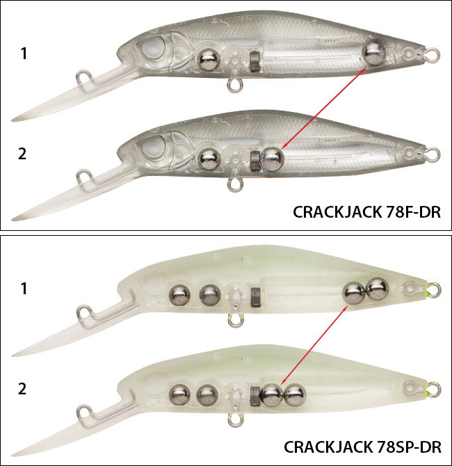 Внутреннее строение воблеров Crackjack 78 DR и положение подвижных грузов при забросе (1) и проводке (2)