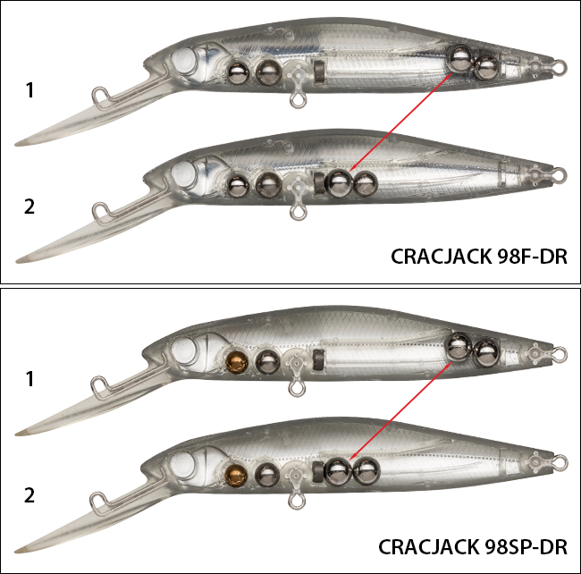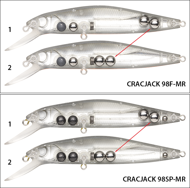 Внутреннее строение воблеров Crackjack 98 MR и положение подвижных грузов при забросе (1) и проводке (2)